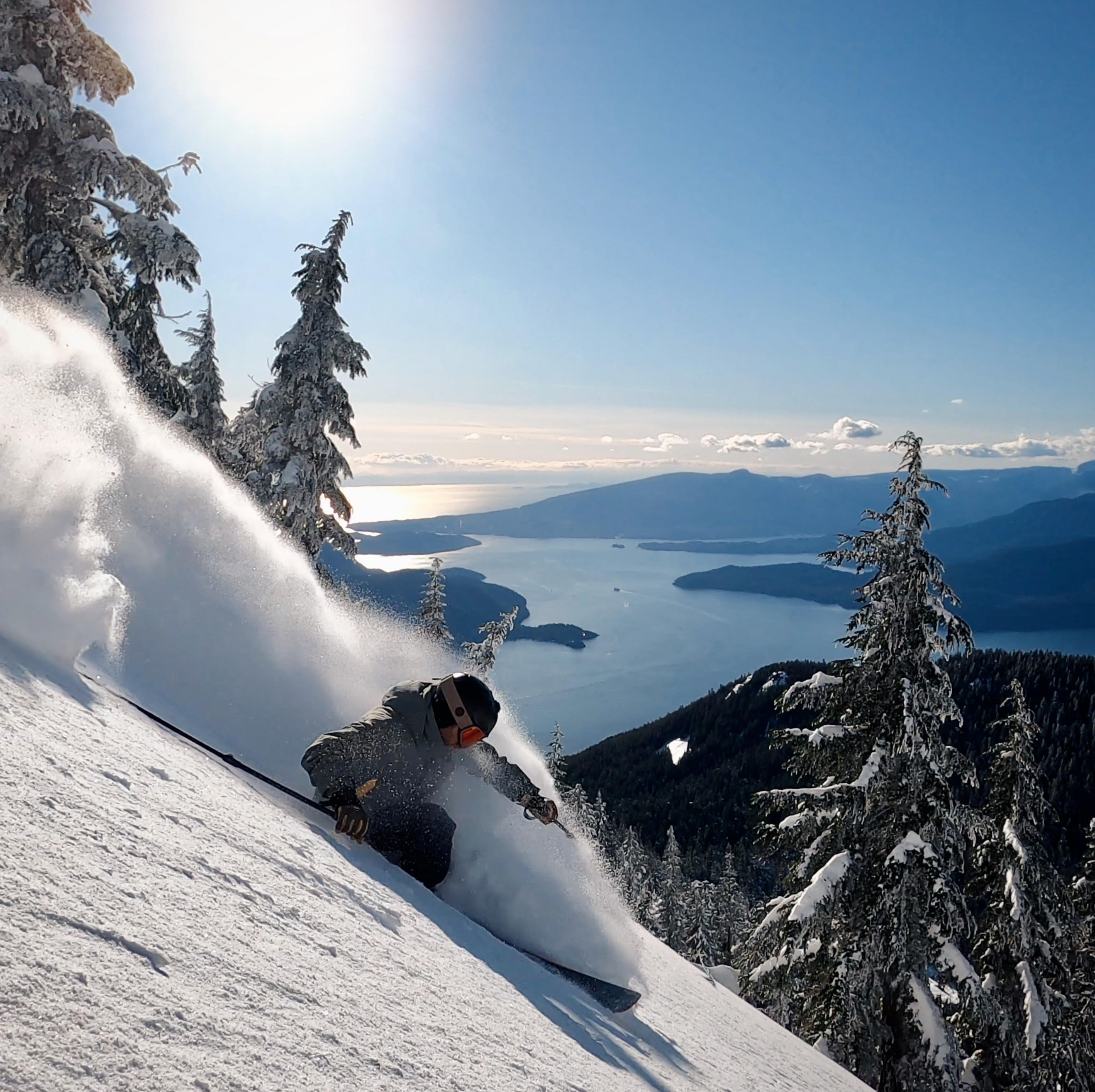 Photo of Mike Douglas skiing fresh powder